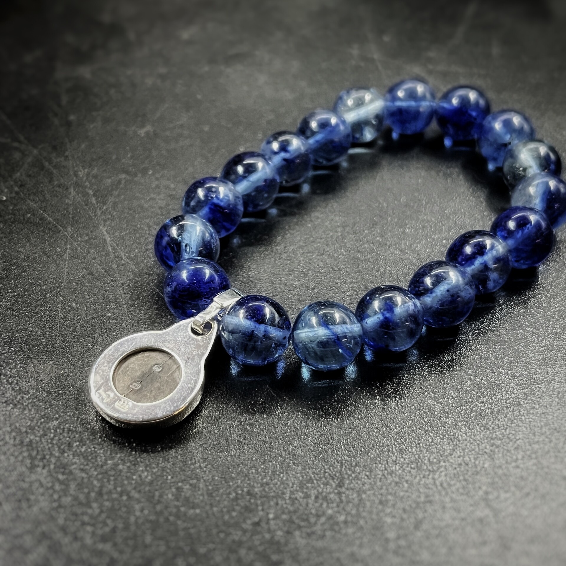 Materials: Original Gucci button set in solid sterling silver, blue glass beads, stretch nylon cord