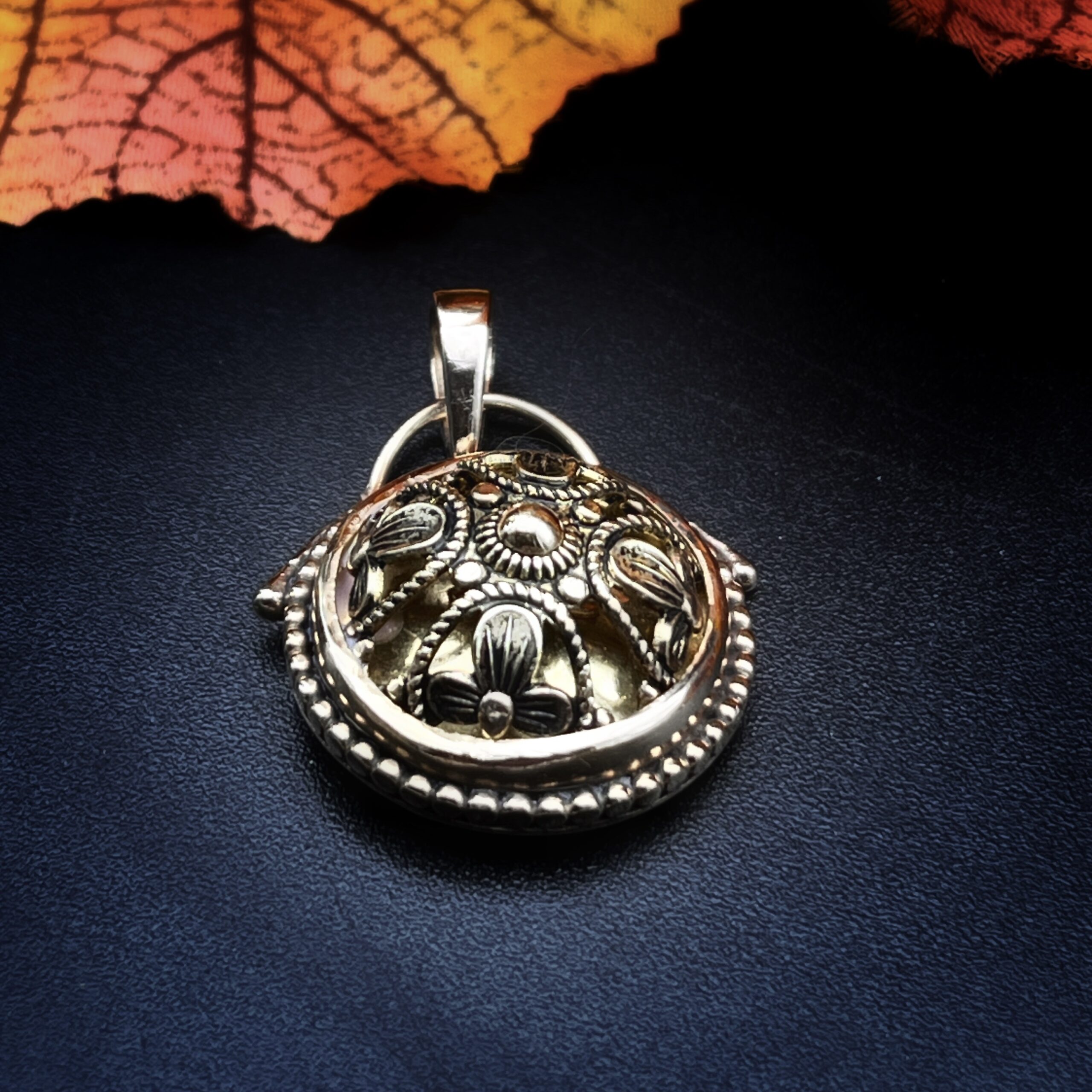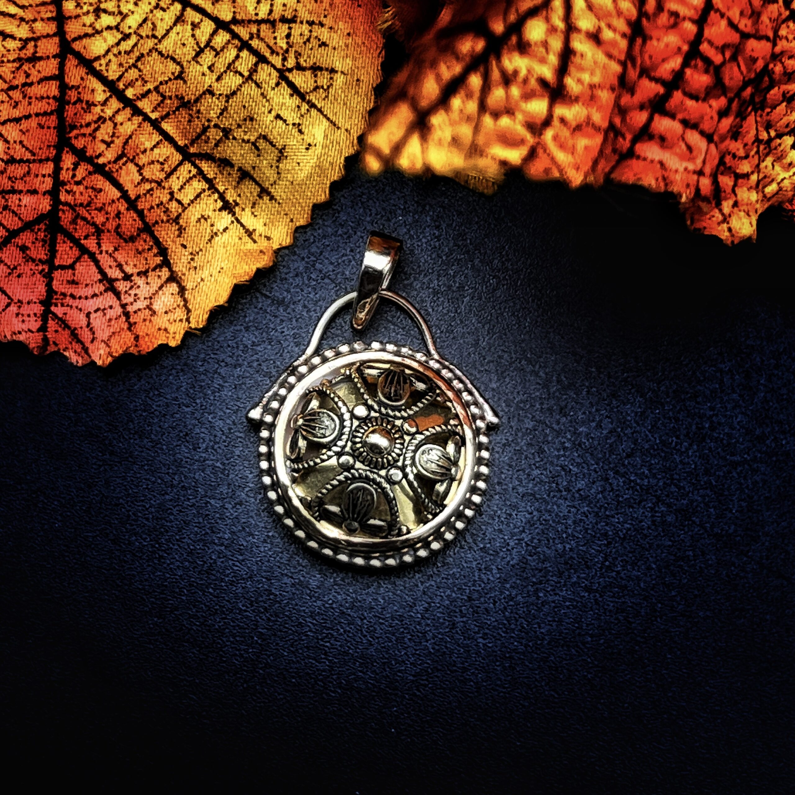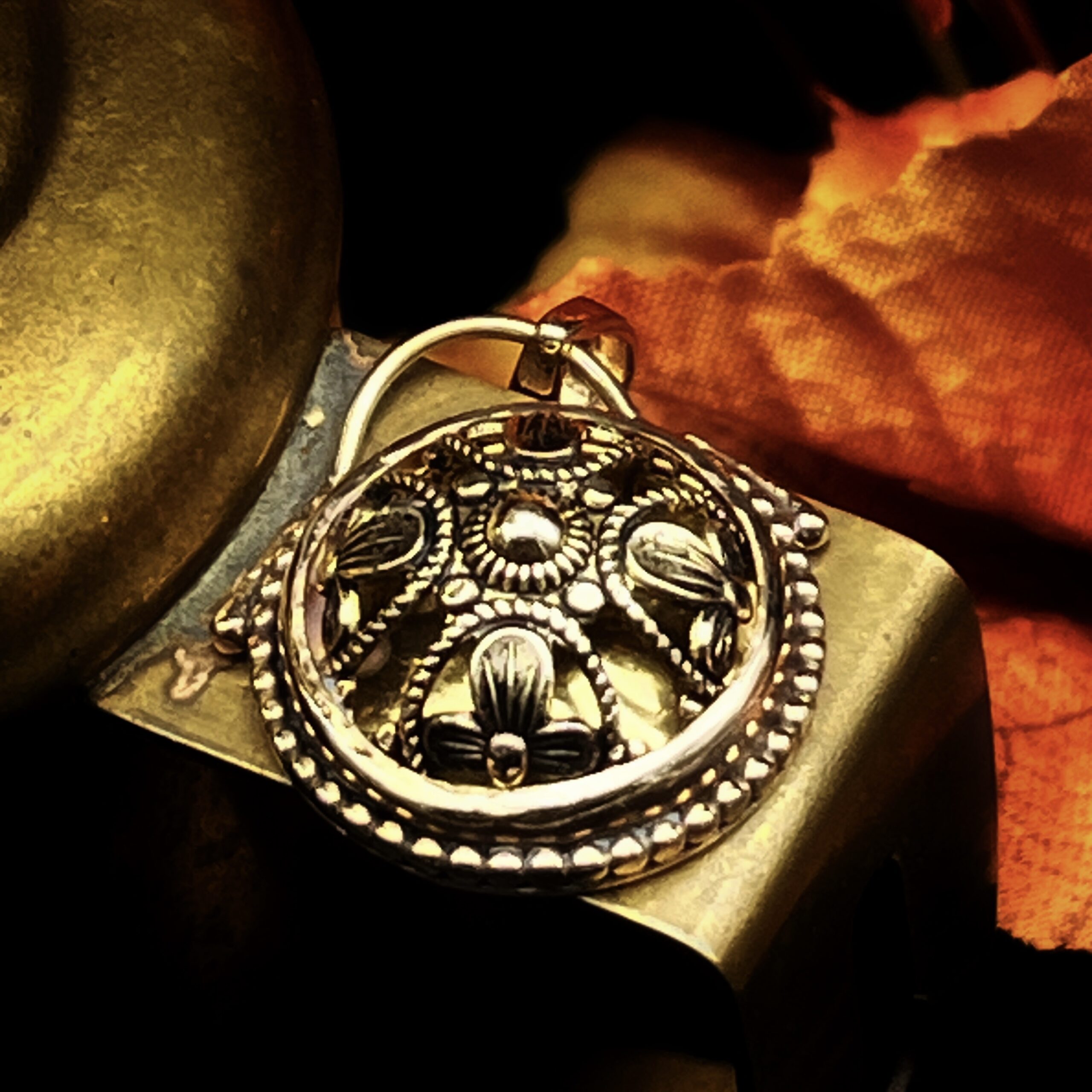 This one of a kind pendant has been entirely handcrafted using traditional Goldsmith techniques, uniting genuine sterling silver, 24ct gold vermeil, and a 19th-century French button.