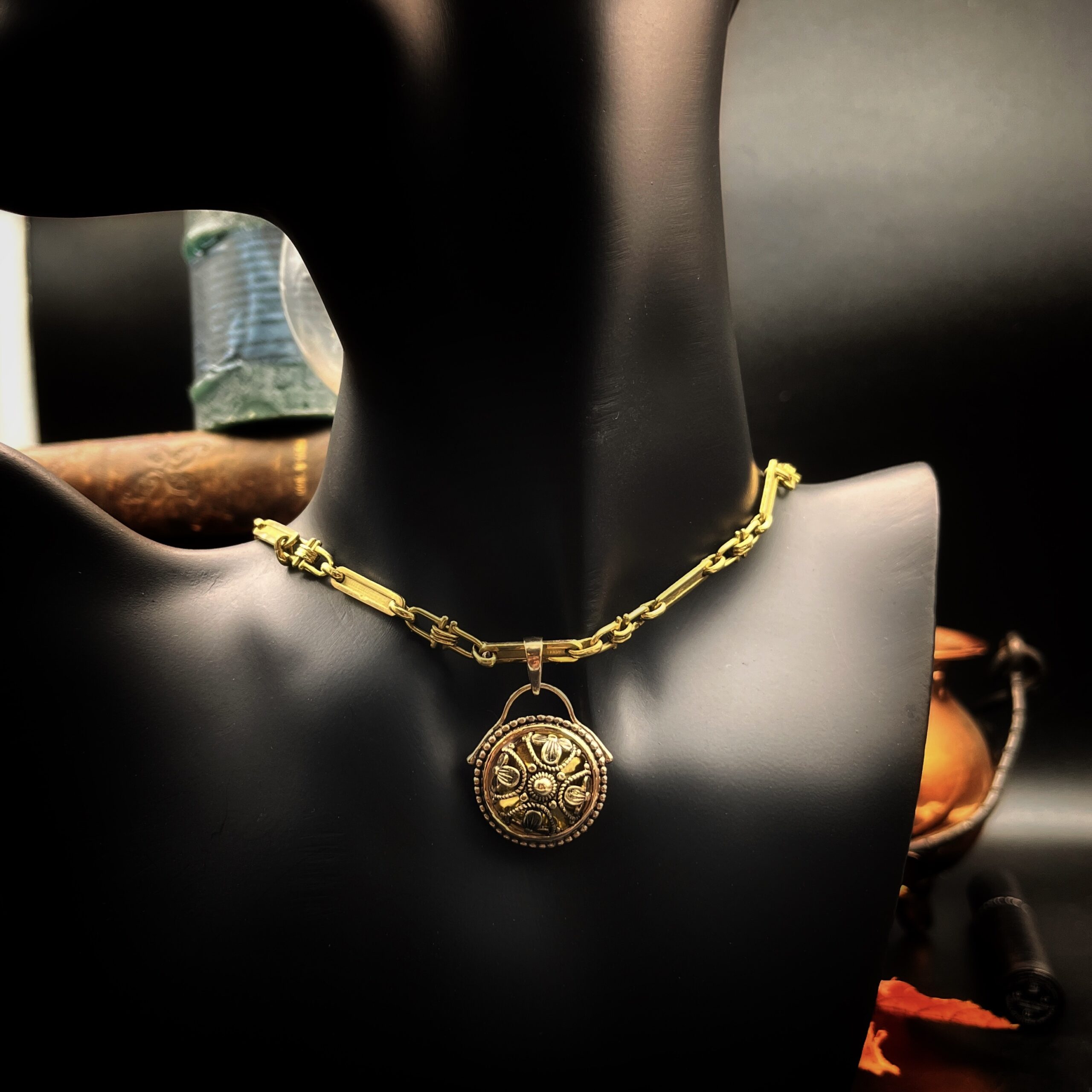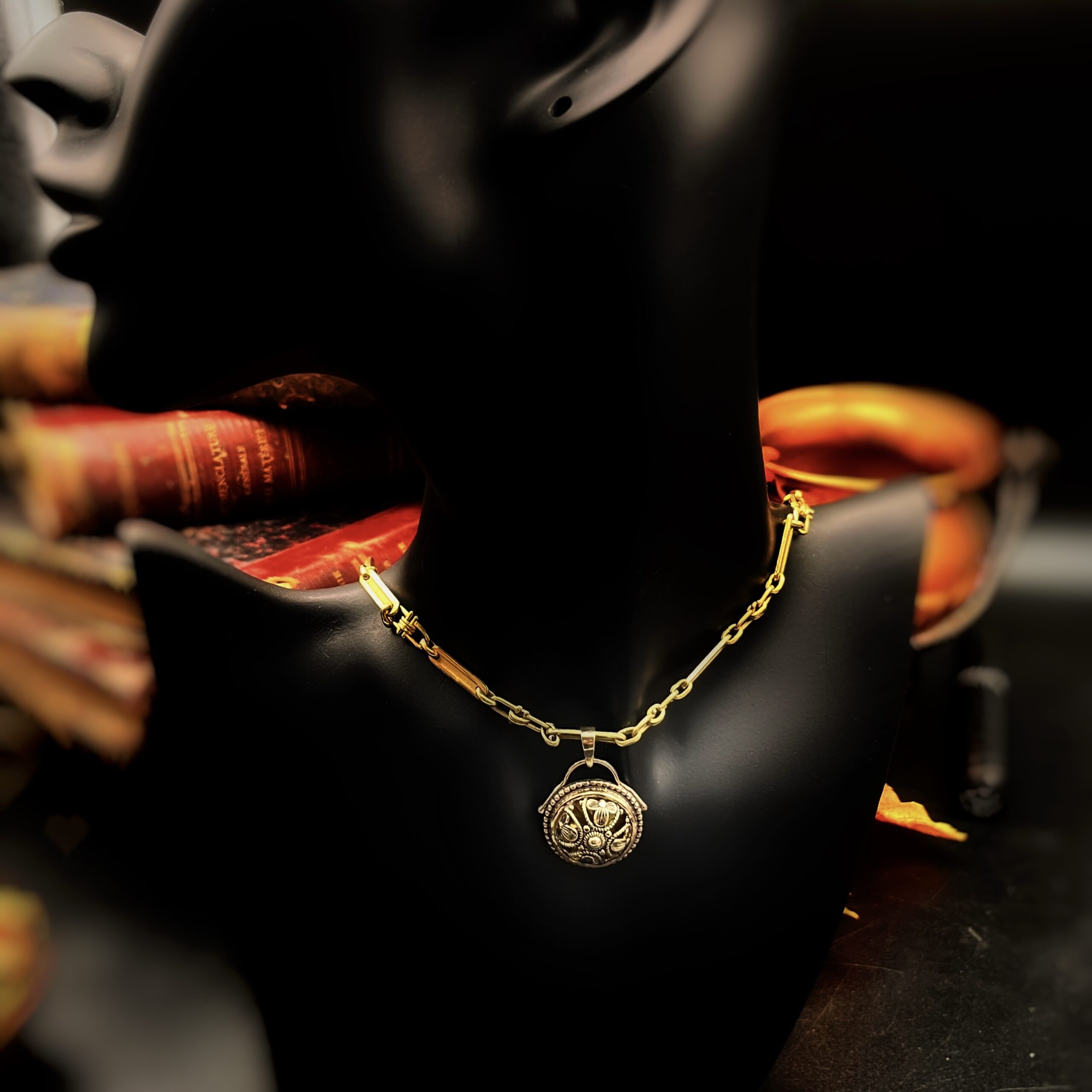 To complement its golden hues and enhance its sense of refinement, the entire pendant has been finished in 24ct yellow gold vermeil plating. This rich layer of gold brings warmth, luxury, and harmony to the original brass button, creating a piece that feels both regal and timeless.