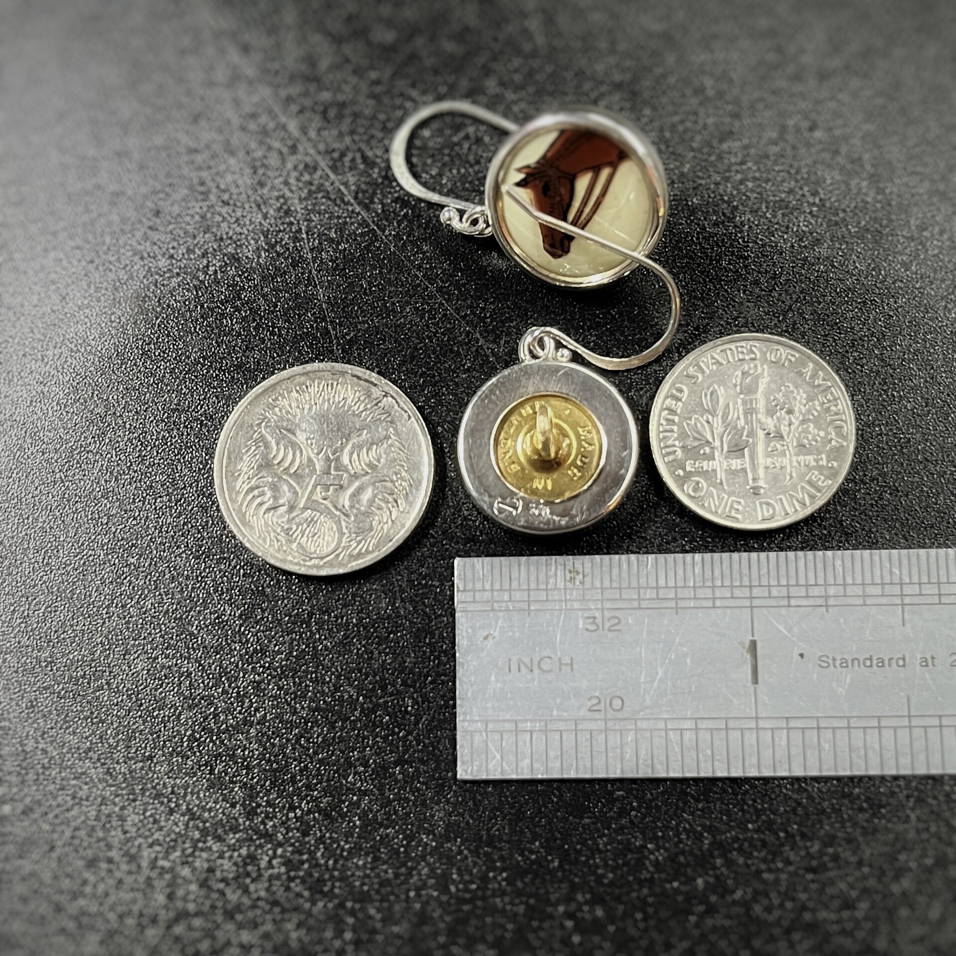 Glass and resin over printed image with original gilt brass setting, solid sterling silver ear fittings