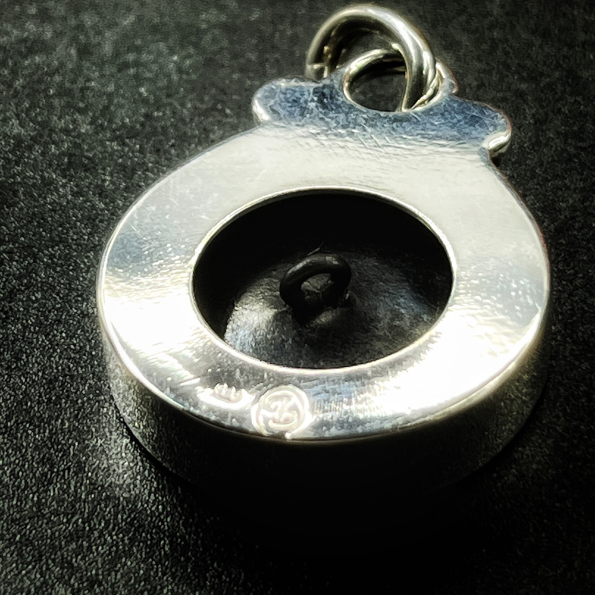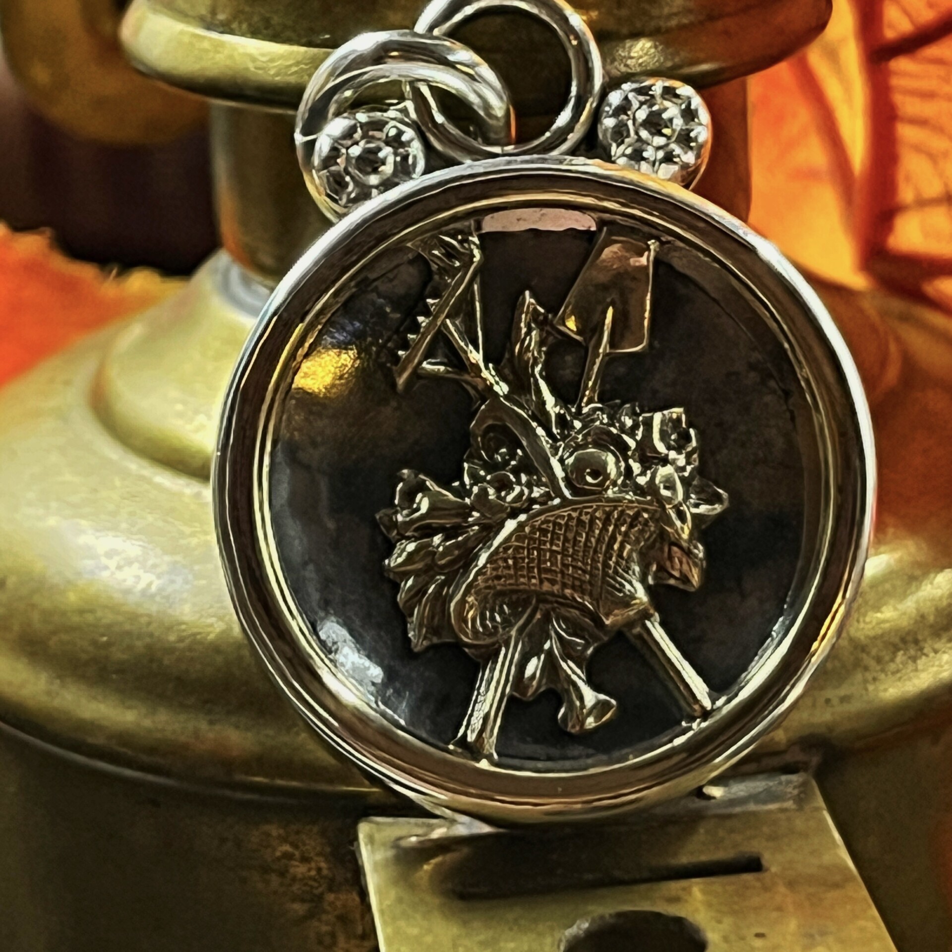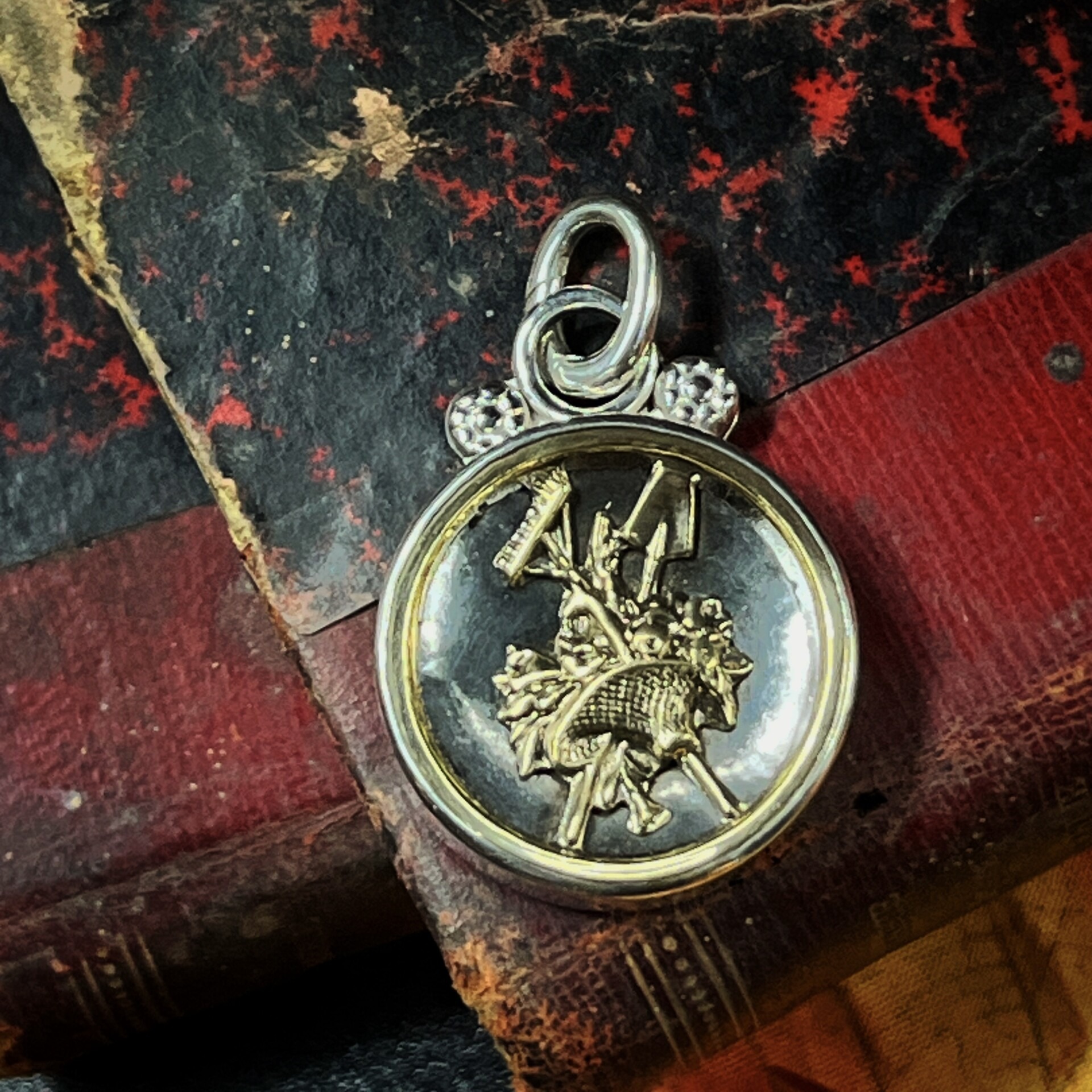 Materials: Antique brass button with brushed relief and charcoal grey background, set in solid sterling silver with decorative silver flowers and carabiner style bail