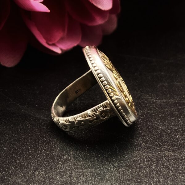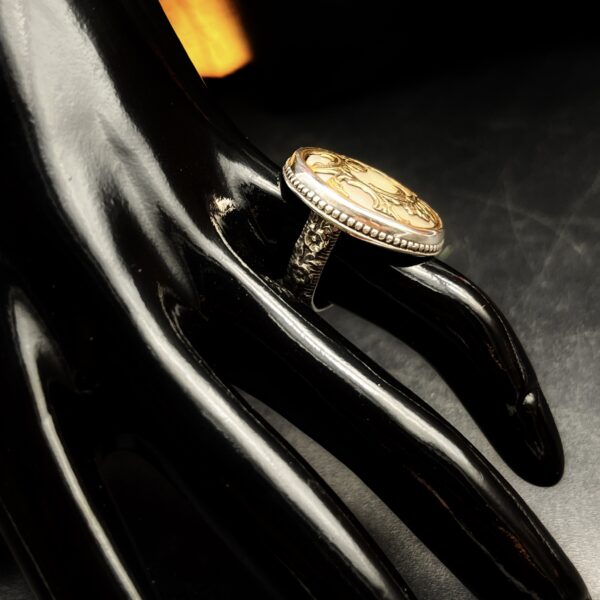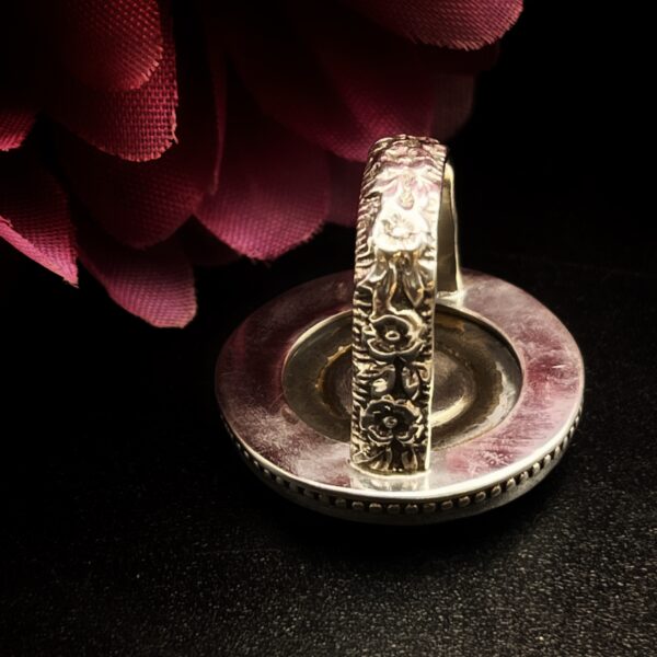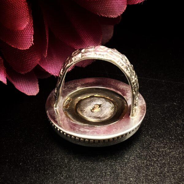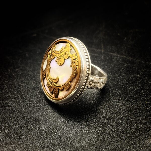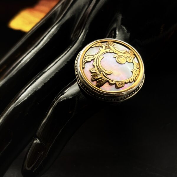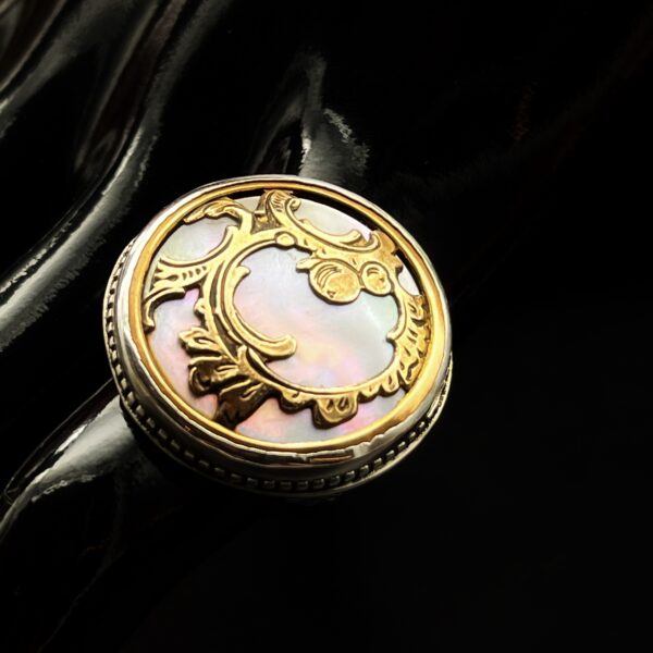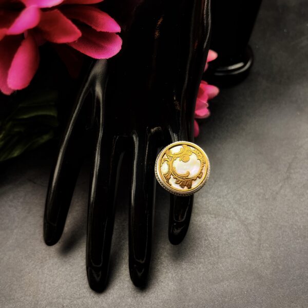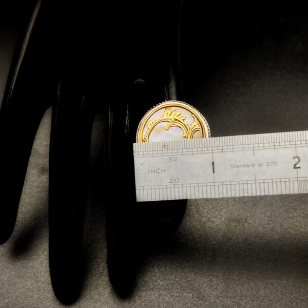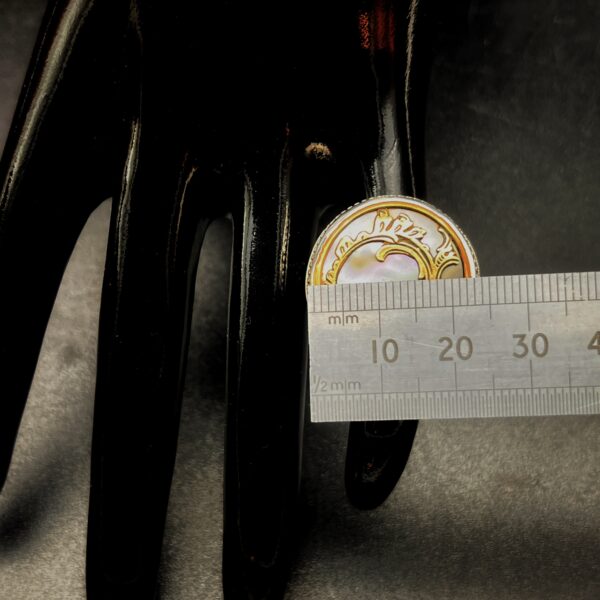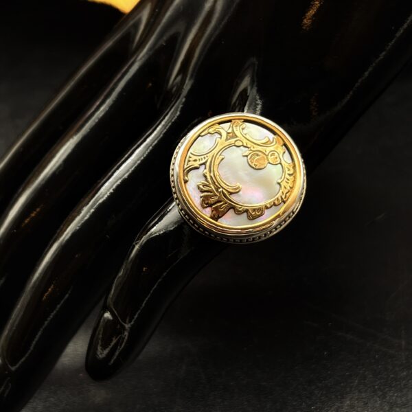 Sometimes these larger settings tend to flip on the finger, so I have made the shank/band slightly more square than round to avoid it flipping which makes the ring much more comfortable. Vintage mother of pearl buttons are making a huge comeback and after seeing this gorgeous ring for yourself, you can see why.