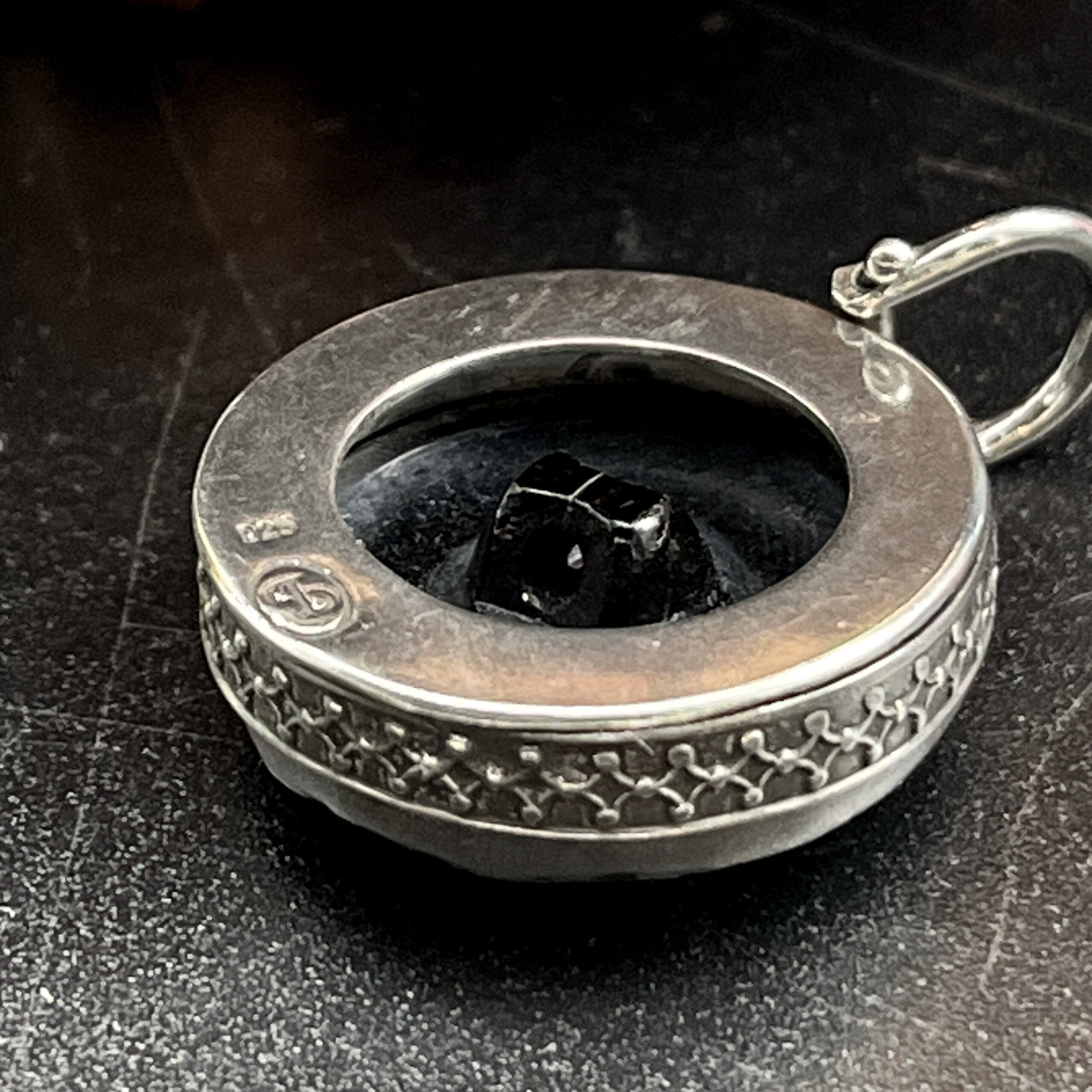 To honour its striking surface and heritage, I created a sterling silver setting that holds the button securely and elegantly. The textured beaten edge adds depth and contrast, enhancing the intricate motifs and vibrant tones. A handcrafted bail and ring complete the piece, lending an added layer of artisan detail.