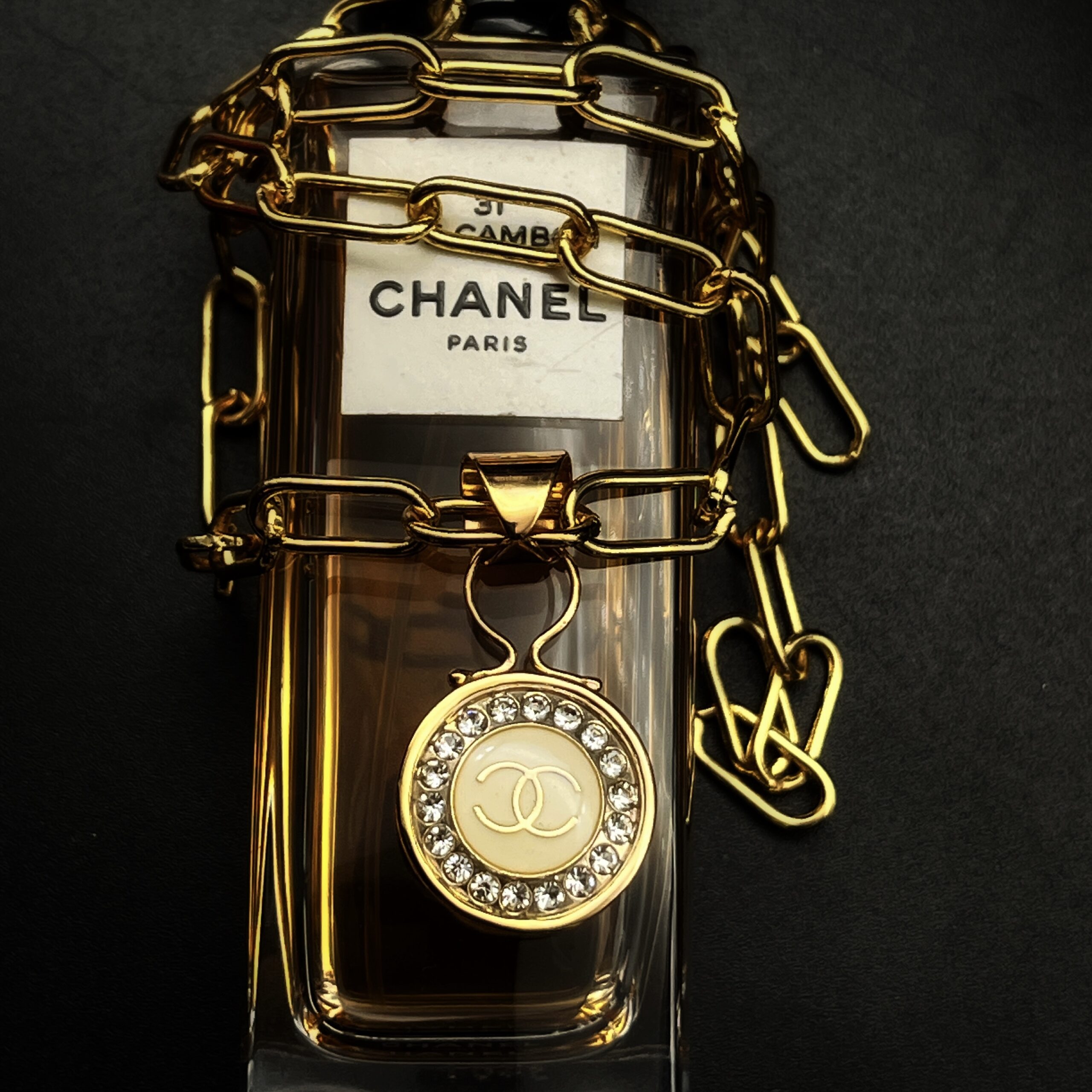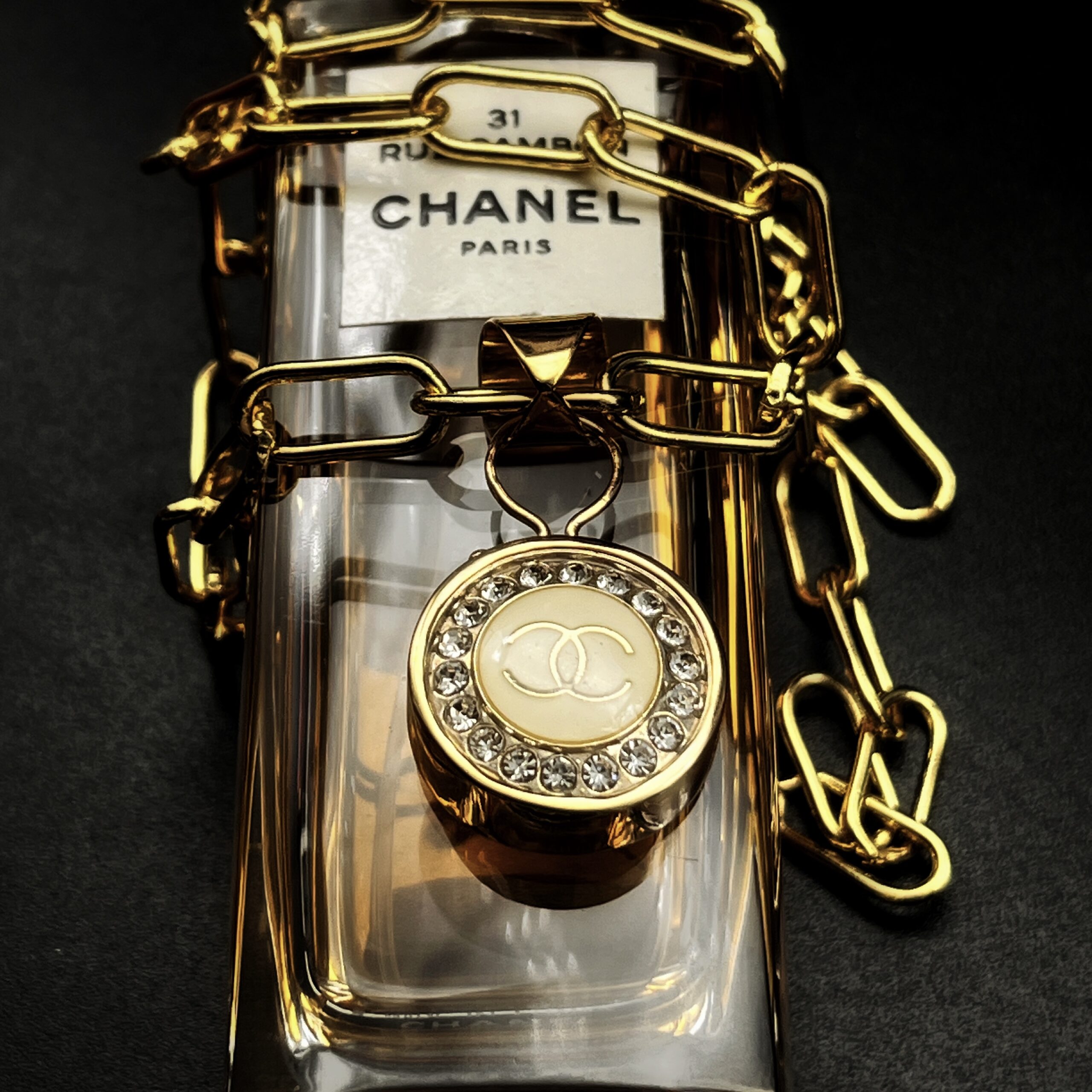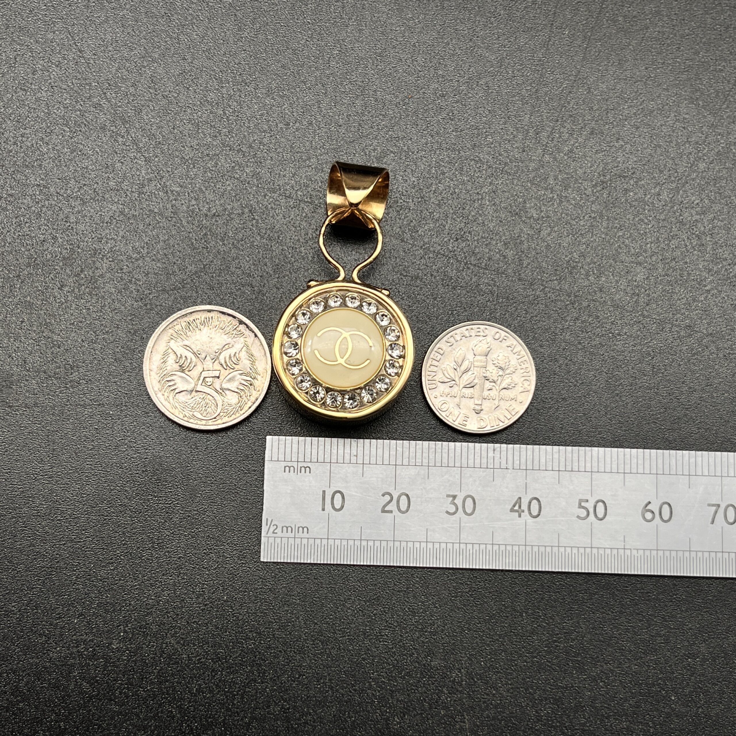 This pendant features a genuine Chanel button from the 1980s, carefully repurposed into a unique Porsha Bella jewellery design. Originally adorning a Chanel bomber jacket, this button represents a pivotal moment in women’s fashion. Do you remember the rise of the bomber jacket in the 1980s? Once considered strictly masculine, Chanel reimagined it for women, softening the silhouette and adding embellishments such as crystal appliqué and dazzling buttons like this one. It was a bold step, a true blending of strength and femininity.