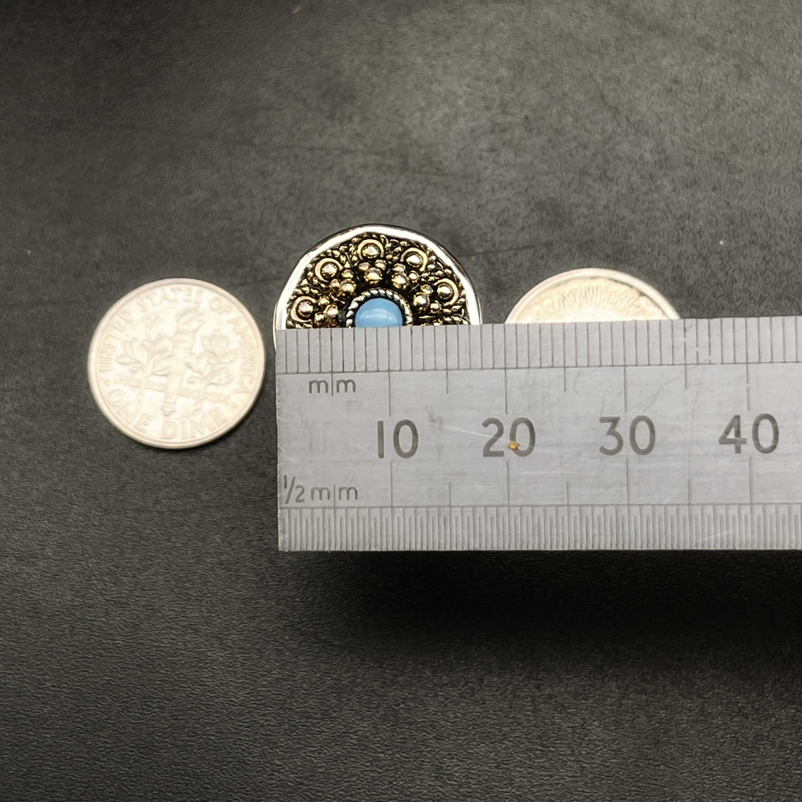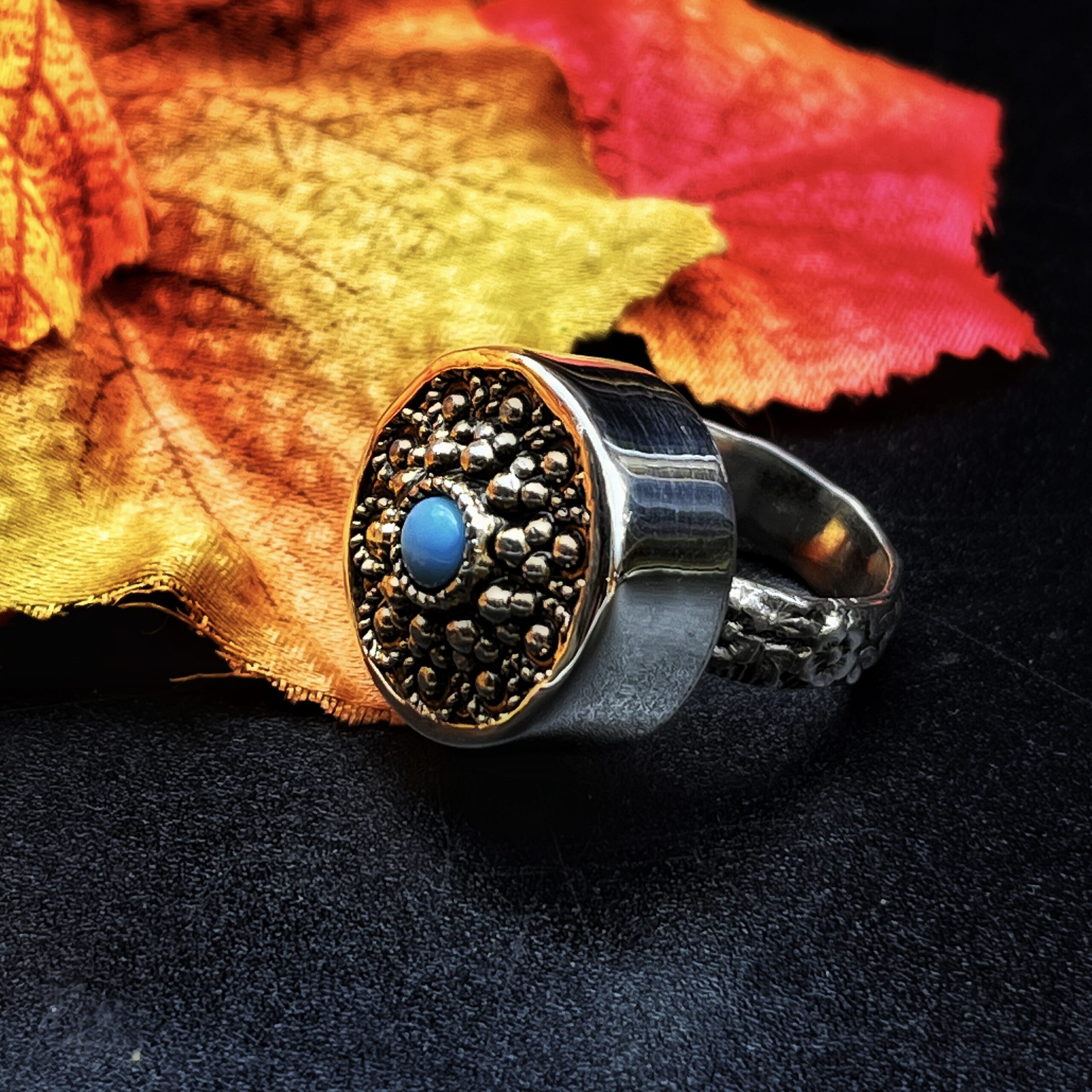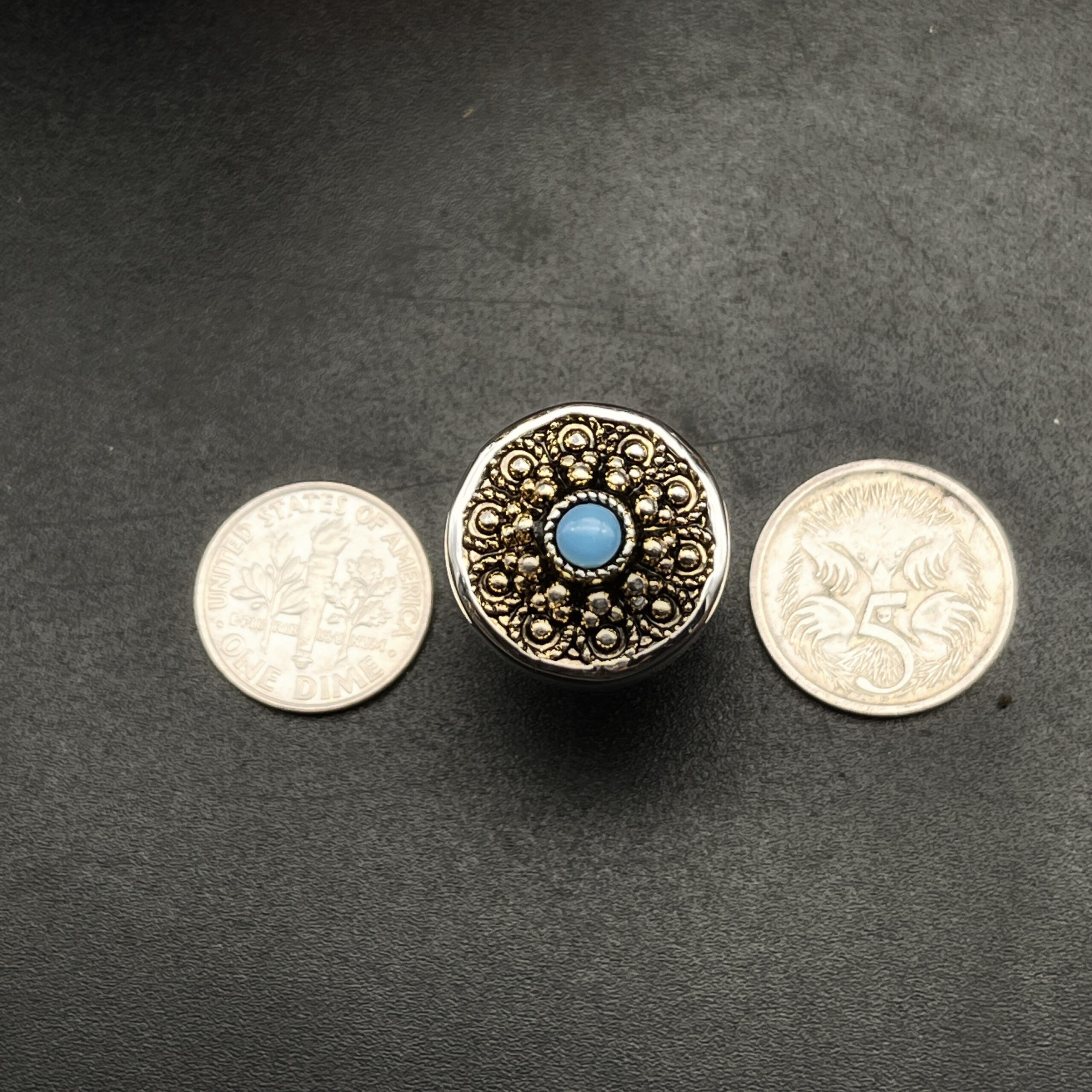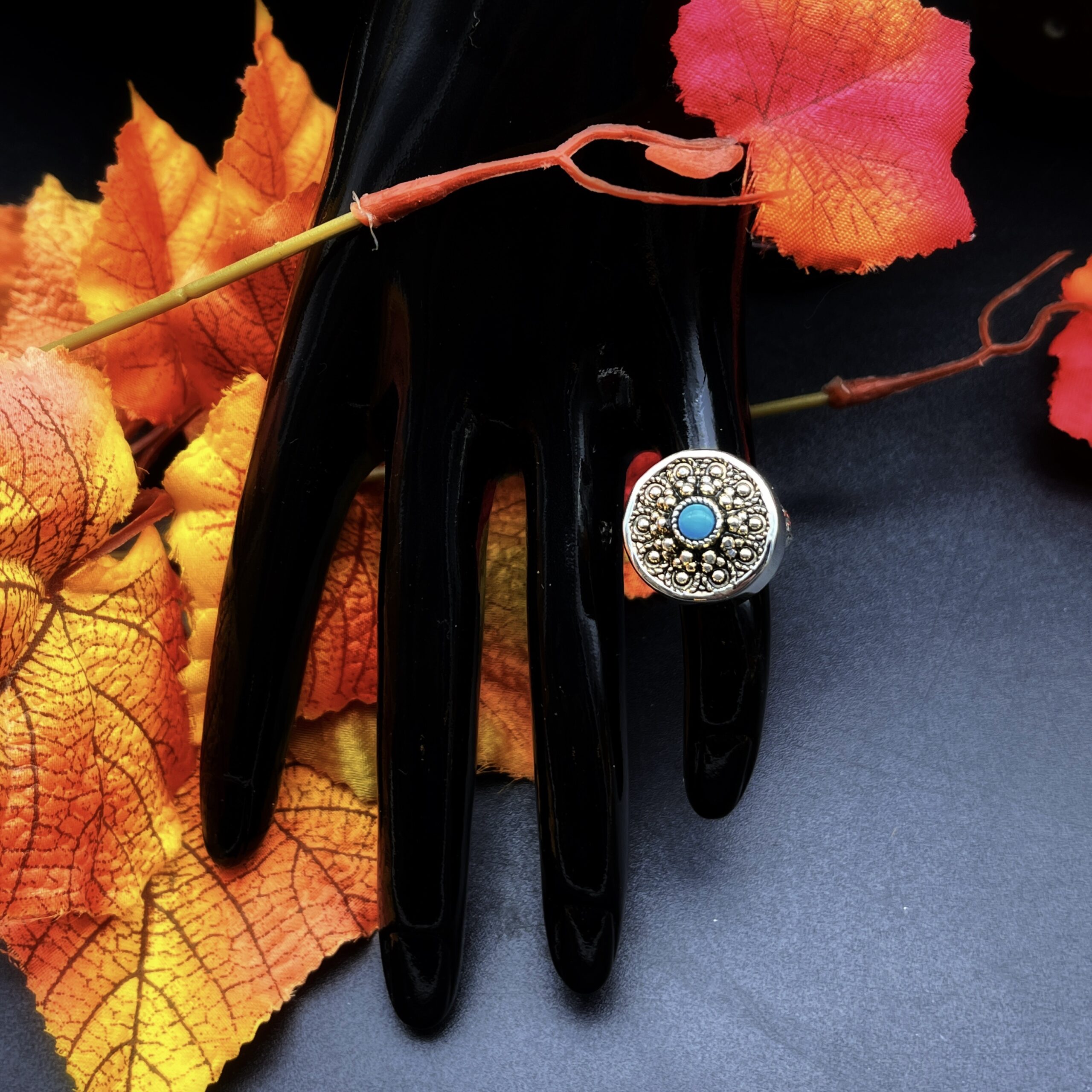 The button’s intricate detailing and turquoise coloured centre give the ring a distinctive vintage boho vibe. Perfectly balancing French sophistication with free spirited charm. Whether you wear gold or silver, this timeless piece complements any style.