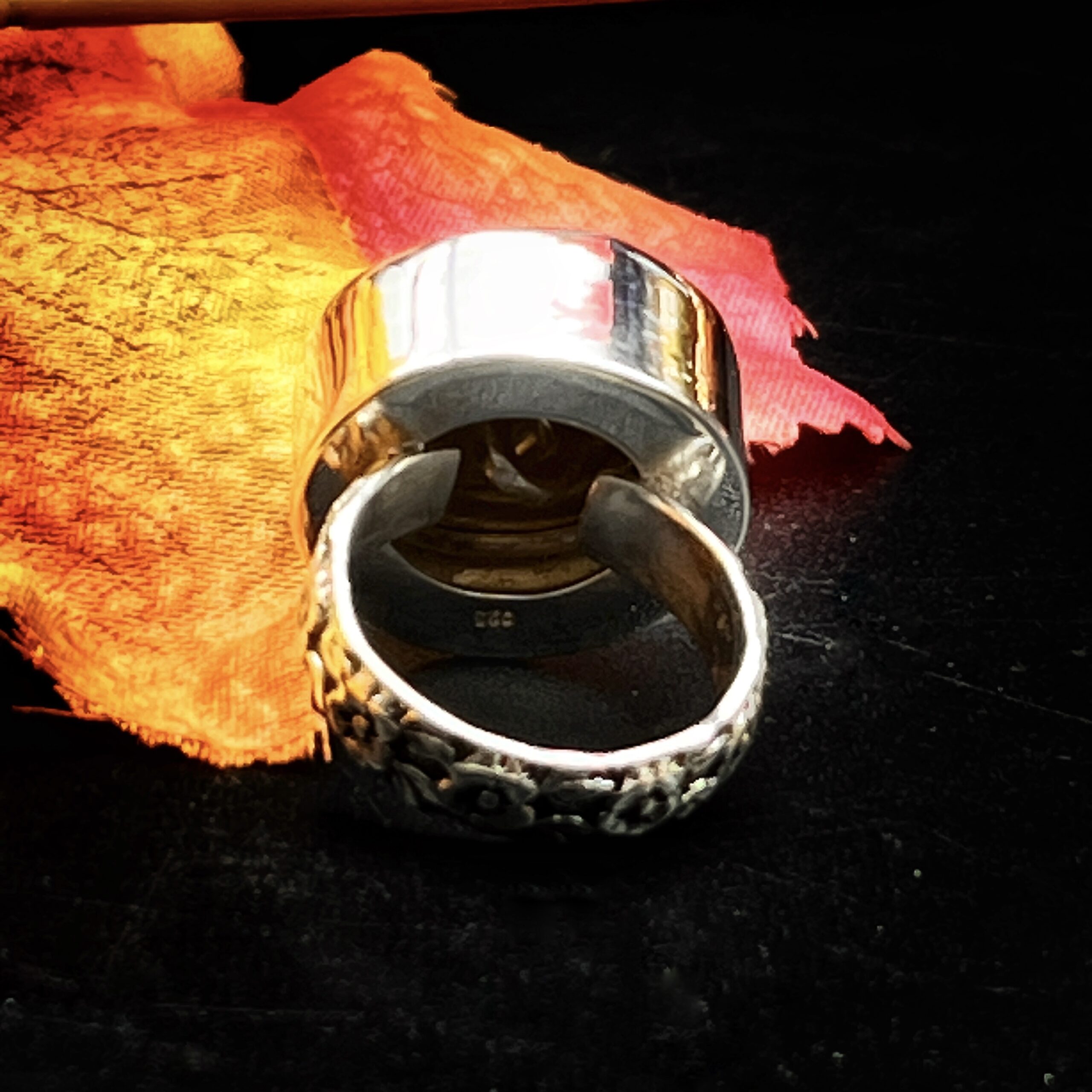 Every element has been handcrafted in solid sterling silver (925). The bezel is thick and sturdy, the floral embossed band beautifully weighty. No castings, just traditional Goldsmith artistry, ensuring this ring feels as luxurious as it looks.