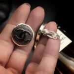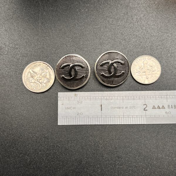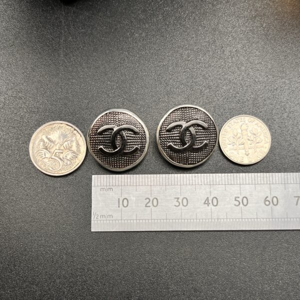 Hand crafted in solid sterling silver to the highest goldsmithing standards, the setting has been designed to enhance, but never overpower the beauty of the vintage Chanel buttons.  The raised, tactile mesh background highlights the iconic interlocking C’s, while the simple, highly polished silver edge frames them with elegance and restraint.  The result is a piece that feels as luxurious to touch as it looks to wear.