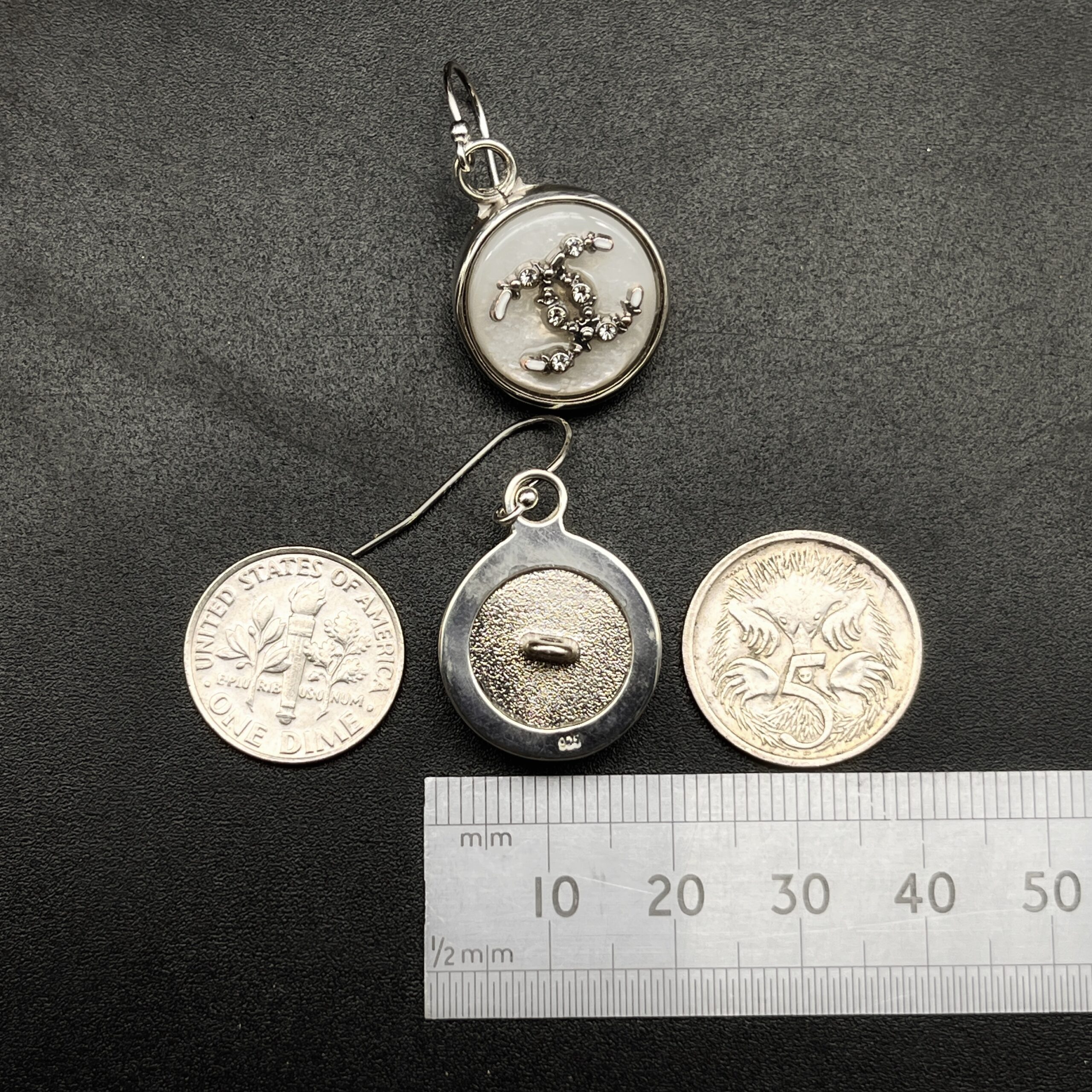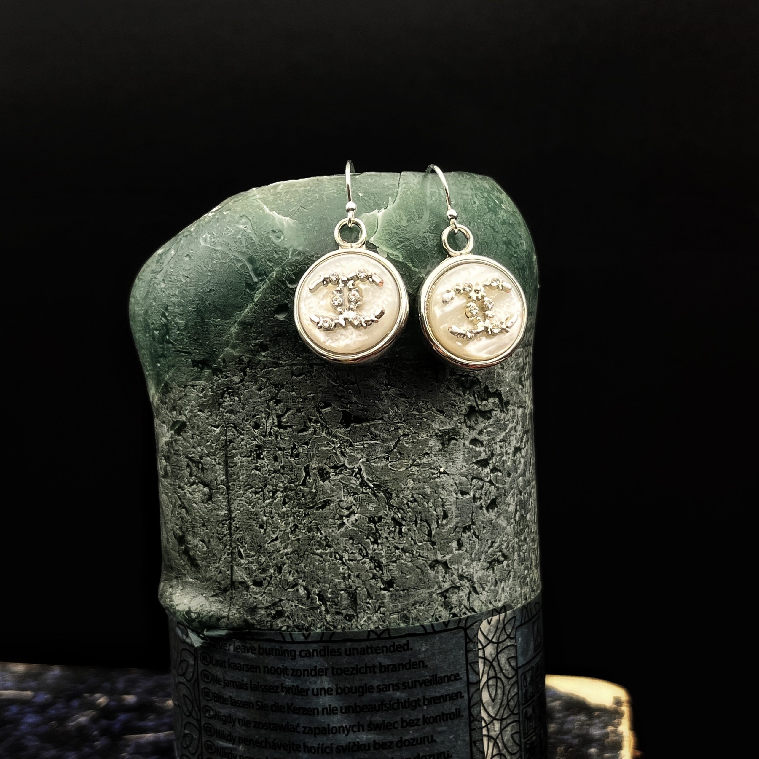 These exquisite earrings feature authentic vintage Chanel buttons from the late 1970s, once gracing a pure white linen jacket, the very picture of understated Parisian luxury. The jacket was lightweight and elegant, worn by a woman who appreciated refinement over extravagance; the kind who would stroll along the Seine on cool spring mornings, linen collar upturned against a gentle breeze, a silk scarf at her throat, and these luminous buttons catching the soft Parisian light.