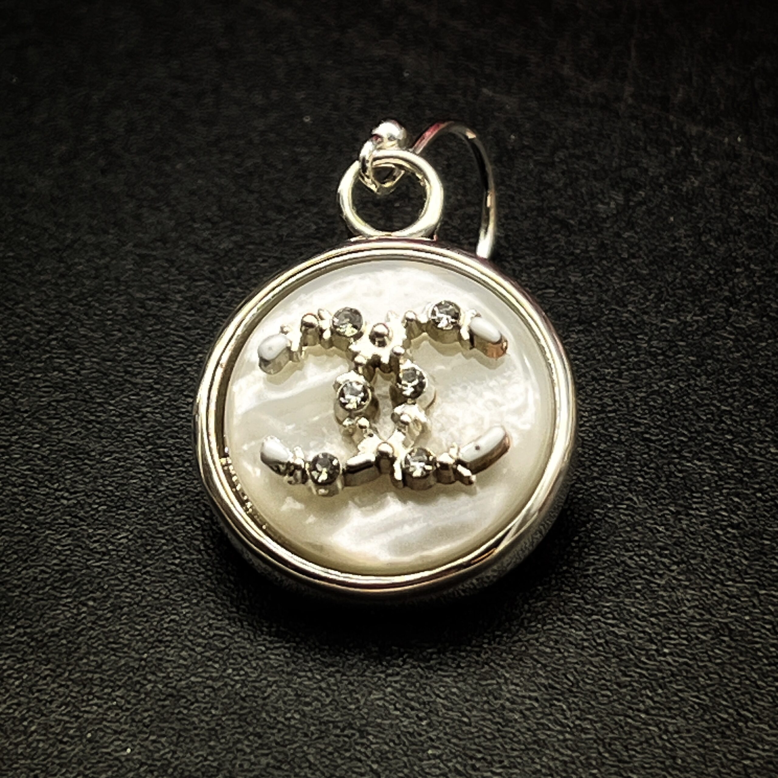 Each button showcases a mother of pearl inspired resin background that shimmers with depth and softness. The raised interlocking Chanel Cs in silver are delicately accented with tiny sparkling crystals and tipped with white enamel, creating a gentle play between pearl and silver tones. The overall effect is not stark white, but rather a subtle, glowing silver. Elegant, timeless, and effortlessly chic. To complement this, I’ve set the buttons in solid sterling silver, enhancing their natural radiance without detracting from their vintage allure. The hooks too are handcrafted from sterling silver, completing the buttons with simplicity.